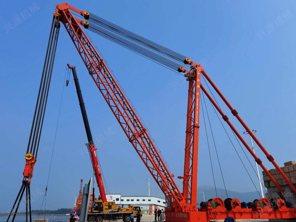 桅桿式起重機(jī)桅桿式起重機(jī),固定安裝的起重機(jī),一般用于港口碼頭桅桿式起重機(jī)又稱(chēng)為拔桿或把桿,是最簡(jiǎn)單的起重設(shè)備。一般用木材或鋼材制作。這類(lèi)起重機(jī)具有制作簡(jiǎn)單、裝拆方便,起重量大,受施工場(chǎng)地限制小的特點(diǎn)。 特別是吊裝大型構(gòu)件而又缺少大型起重機(jī)械時(shí),這類(lèi)起重設(shè)備更顯它的優(yōu)越性。但這類(lèi)起重機(jī)需設(shè)較多的纜風(fēng)繩,移動(dòng)困難。另外,其起重半徑小,靈活性差。因此,桅桿式起重機(jī)一般多用于構(gòu)件較重、吊裝工程比較集中、施工場(chǎng)地狹窄,而又缺乏其它合適的大型起重機(jī)械時(shí)。